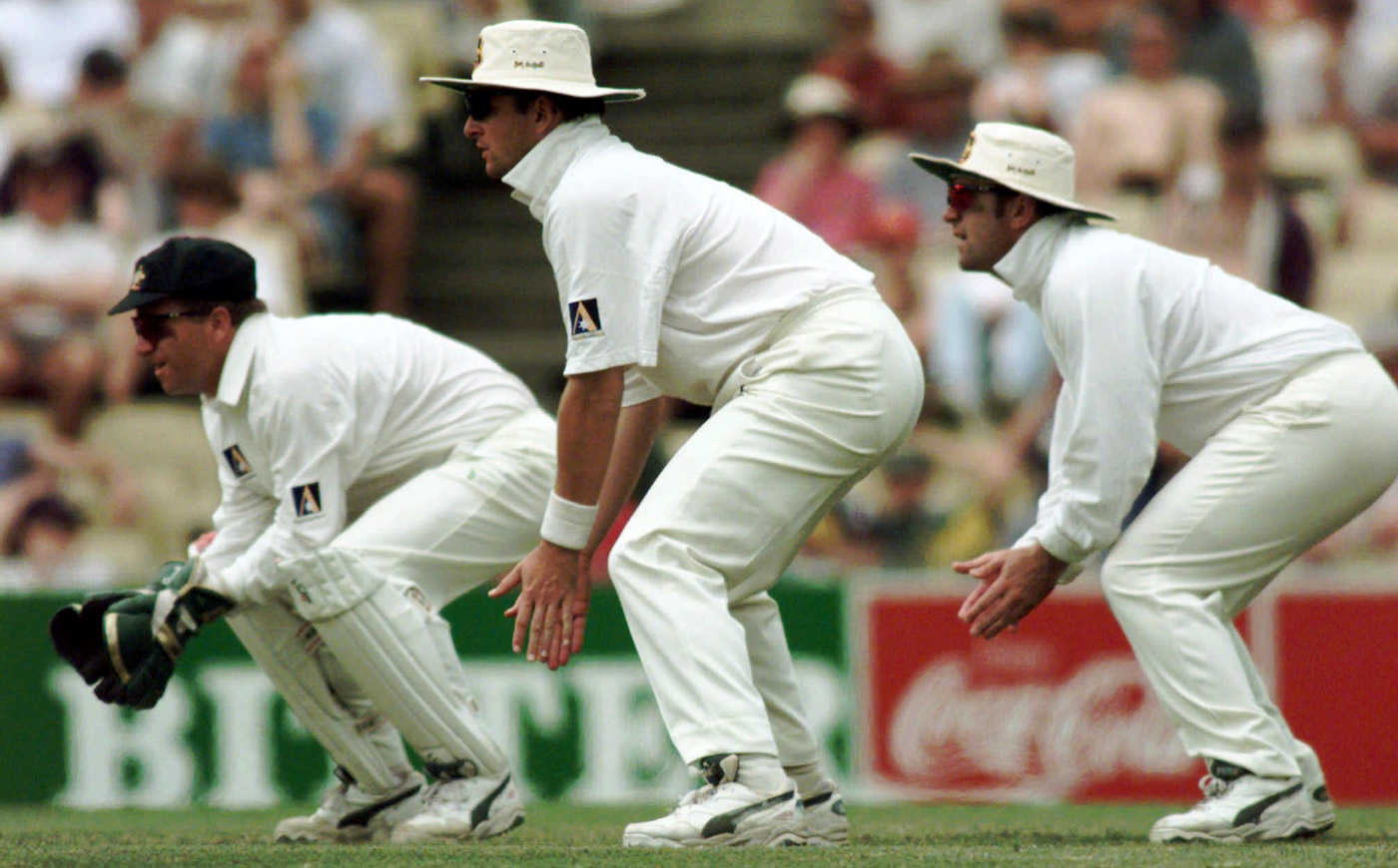 (From left) Ian Healy fields alongside Mark Taylor and Mark Waugh at the SCG against West Indies in 1996