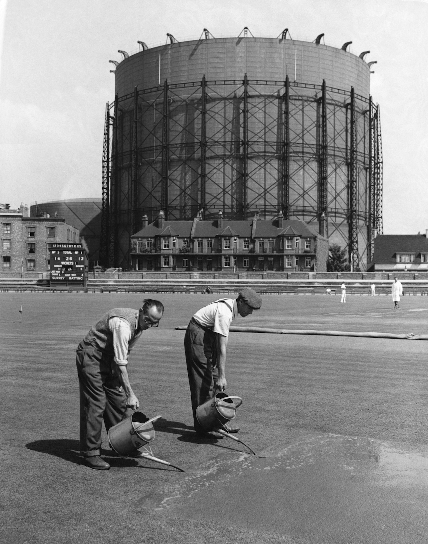 Workers water and fertilise the turf at The Oval before the final match of the 1953 Ashes